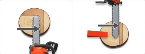 Barkstöden fungerar som en vridpunkt mellan motorkropp och sågsvärd. Sätt an barkstödets nedre spets vid den tilltänkta brytmånsbredden. Tryck med vänsterhanden mot främre handtaget samtidigt som du lyfter bakre handtaget med högerhanden. Såga med dragande kedja tills du har uppnått lämplig brytmånsbredd. Brytmånen ska vara jämntjock. Glöm inte att sätta in fällkilen i sågspåret efter att du har sågat drygt hälften av diametern.